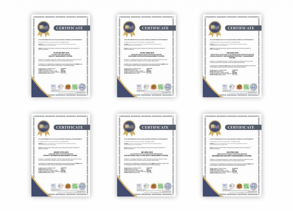 Save Openbook İnsan Kaynakları olarak, kalite, güvenlik, müşteri memnuniyeti ve sürdürülebilirlik alanlarında en üst standartları yakalamayı ve sürekli geliştirmeyi temel prensip edindik. Bu doğrultuda, uluslararası kabul görmüş çeşitli ISO standartları kapsamında sertifikasyonlarımızla faaliyetlerimizi belgeleyerek güvenilirliğimizi perçinlemekteyiz. Sahip olduğumuz ISO belgelerimiz: